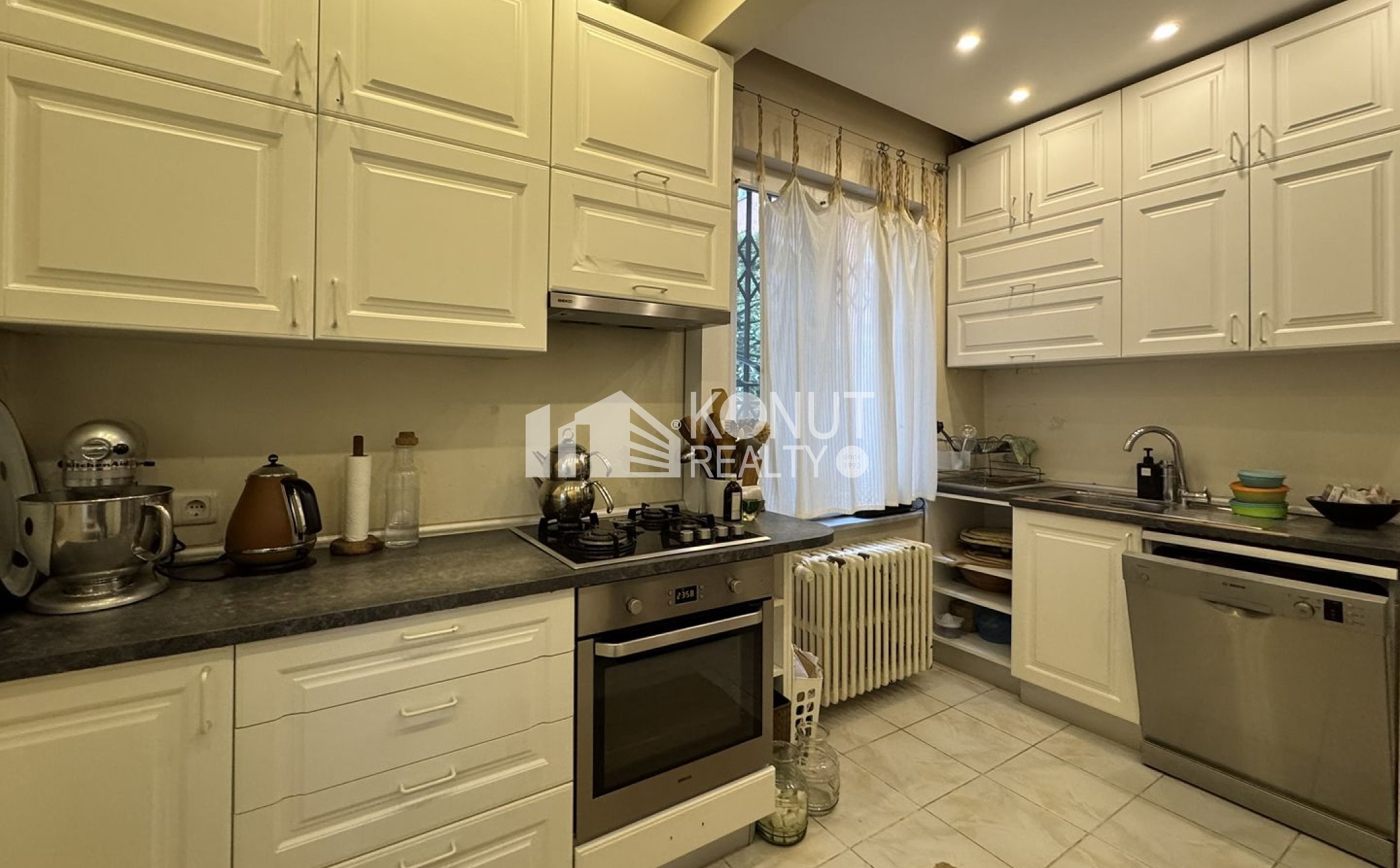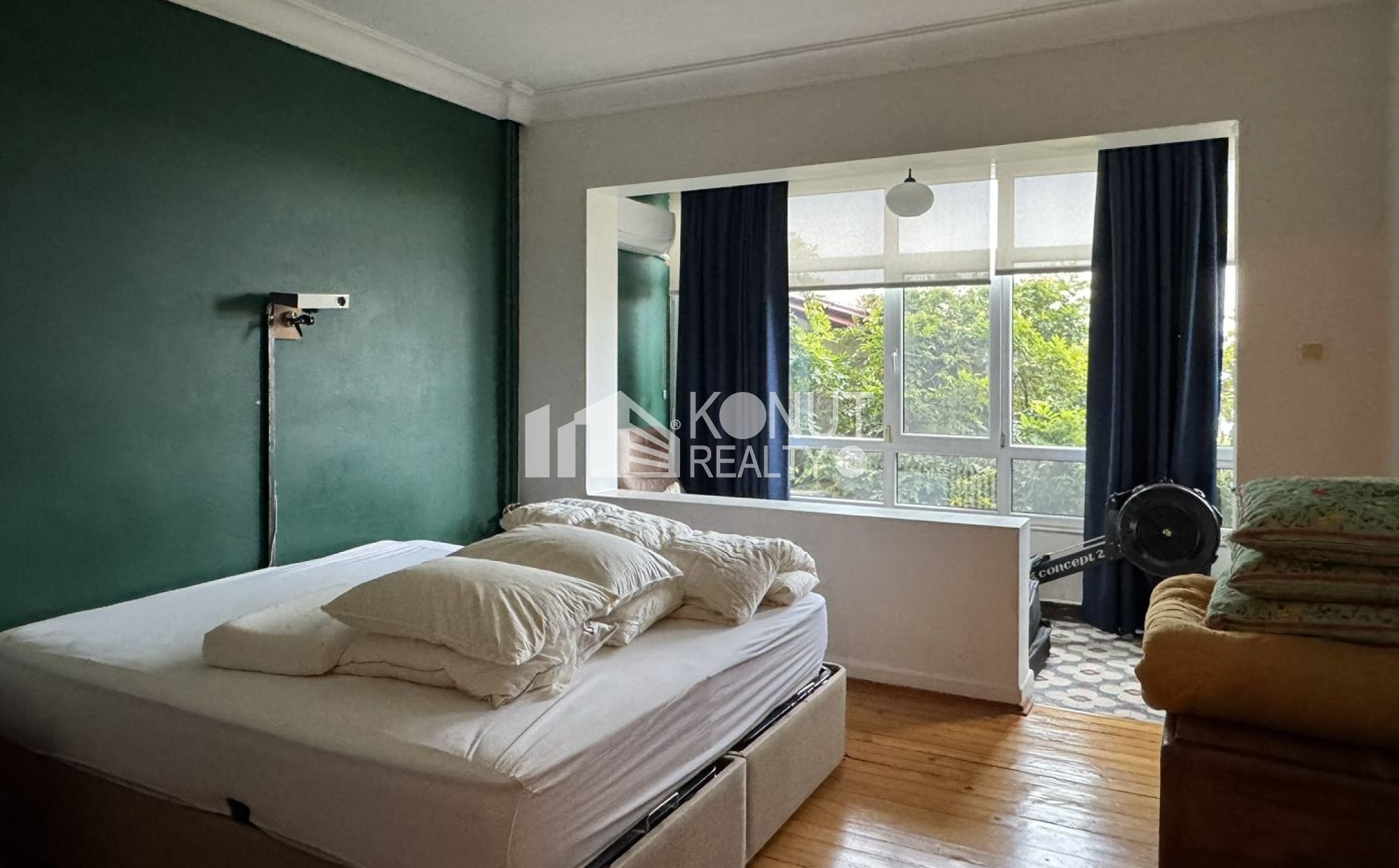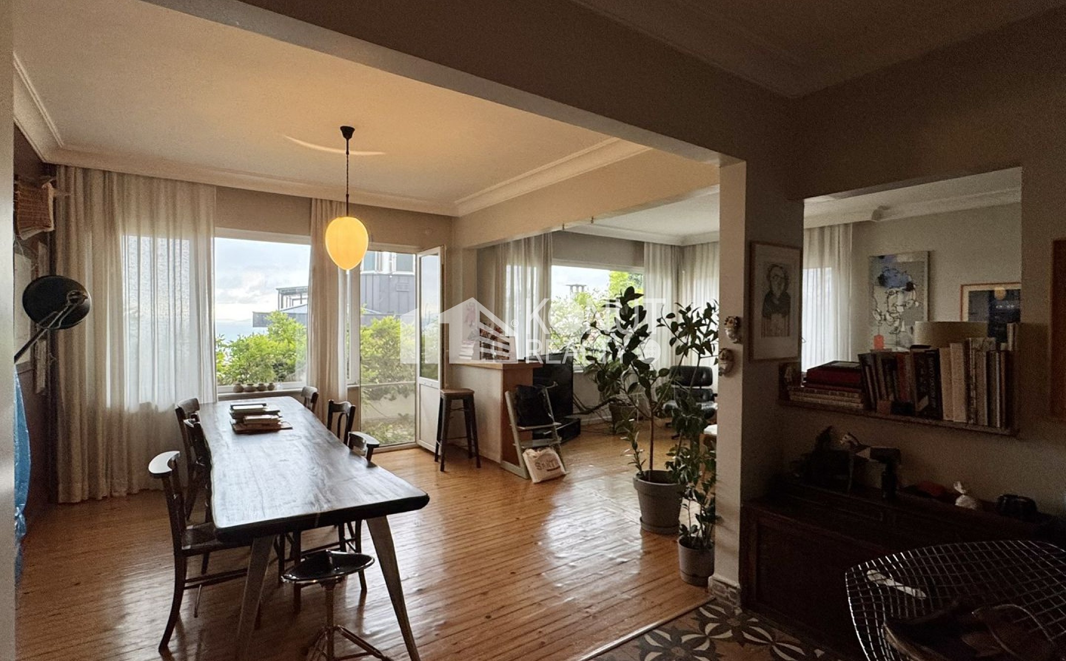 Cihangir'de sakin bir konumda, 3 katlı binanın giriş katında, 140 m², balkon, salon, 3 yatak odası, mutfak, banyo ve wc planında, deniz manzaralı, boş teslim, kiralık daire.